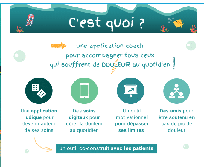 L’idée est d’outiller les patients douloureux d’une appli communautaire de gestion de leurs pics de douleur en mobilisant d’autres disciplines que les antalgiques: cohérence cardiaque, sophrologie, yoga, jeux, massages… mais aussi de suivre leur état de santé au quotidien (sommeil, activités physiques, …)