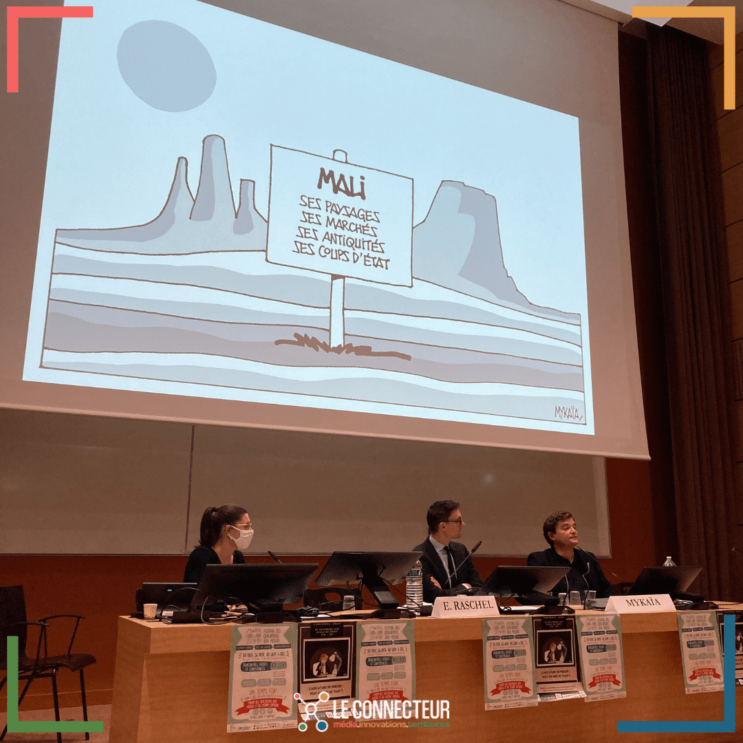Mykaïa est dessinateur de presse. Né en Tunisie, c’est là qu’il a commencé sa carrière au sein de La Presse de Tunisie, l’équivalent du Monde. Il raconte. « Pour m’accueillir, mon rédac chef m’avait dit « Tu es un enfant du pays, tu sais donc que la Tunisie est un pays libre. Tu pourras donc parler de tout ce que tu veux. Sauf de sexe, de religion et de politique ». Durant les deux ans que j’ai passé là-bas, j’ai toujours joué avec les limites de cet exercice, en prenant les sujets de biais, au second degré … Il fait partie de l’association Cartooning for Peace créée en réaction aux … réactions justement, post attentat de Charlie Hebdo, en 2005. Elle est le fruit d’une rencontre entre Cabu et Kofi Annan qui disait alors « Les dessins de presse nous font rire. Sans eux, nos vies seraient bien tristes. Mais c’est aussi une chose sérieuse: ils ont le pouvoir d’informer mais aussi d’offenser. » L’association mène des actions pédagogiques en France et à l’étranger et agit pour la défense de liberté d’expression. Parce que le danger le plus menaçant, c’est celui de l’autocensure.