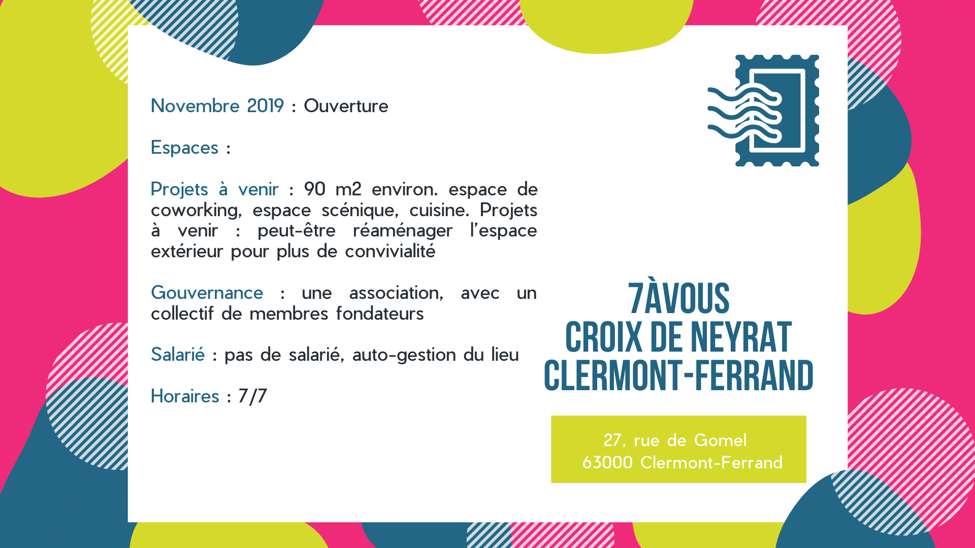 7àVous, est un tiers-lieux participatif à Croix de Neyrat à Clermont-Ferrand. Initié par Anas Dadir, il rassemble plus d’une dizaine d’associations et un collectif de citoyens. A l’image du quartier, il propose une diversité de rencontres et d’événements avec une orientation culture et DIY. Nous vous proposons cette semaine une courte halte dans les quartiers Nord de Clermont.