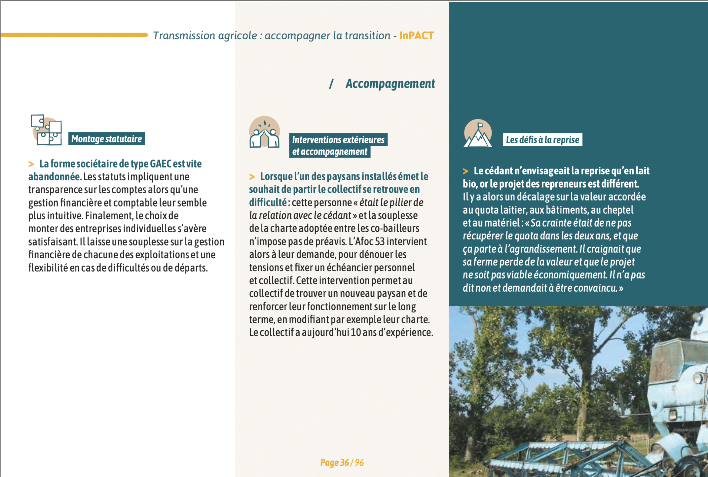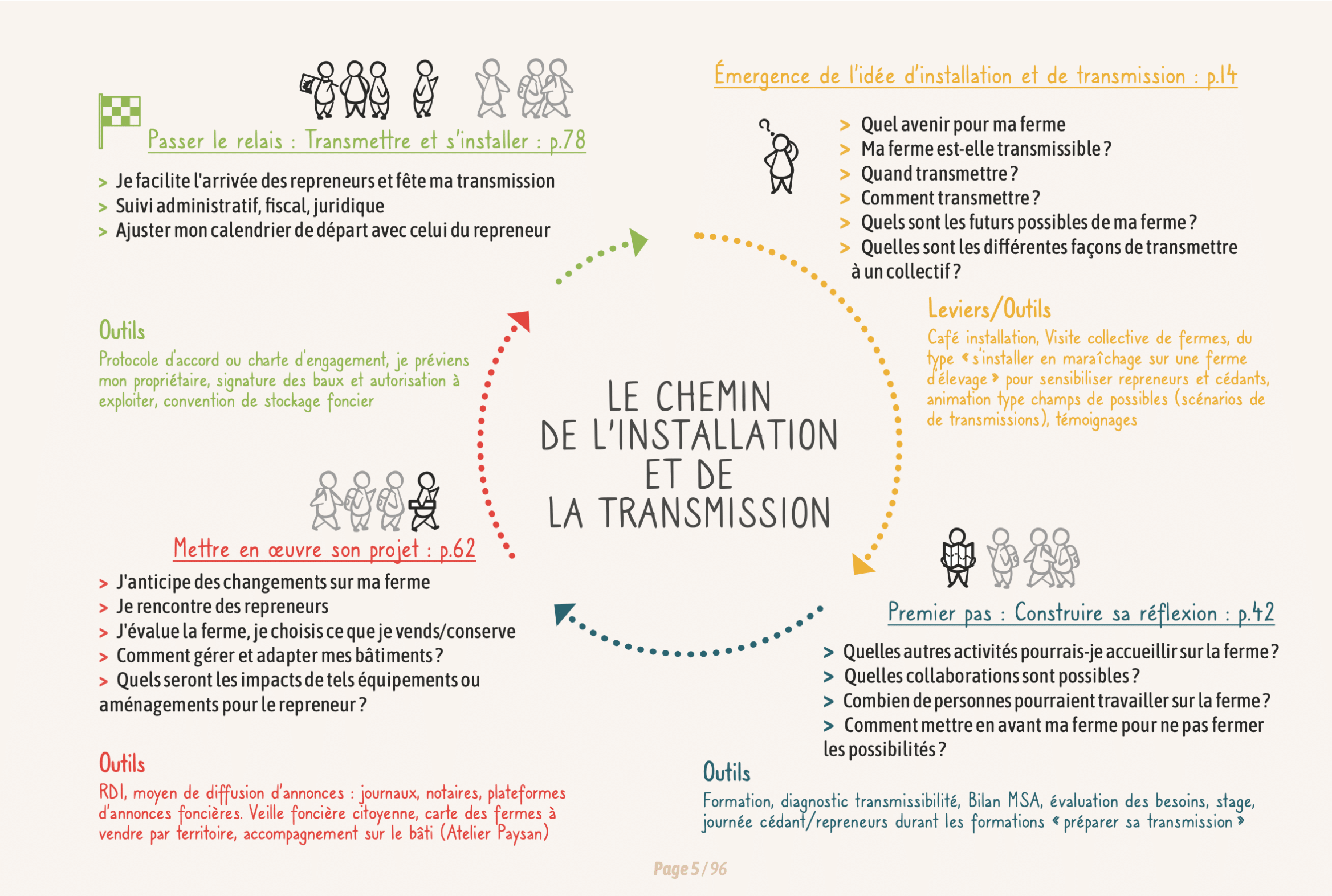 Le pôle national « Initiatives Pour une Agriculture Citoyenne et Territoriale », Inpact, publie un livret qui présente les enseignements d’une étude menée sur l’accompagnement à la transmission sur 21 fermes avant restructuration. Elle établit un cycle « idéal » pour permettre une transmission gagnant-gagnant entre l’agriculteur et le nouveau porteur de projet. Des outils sont développés pour faciliter la réflexion.