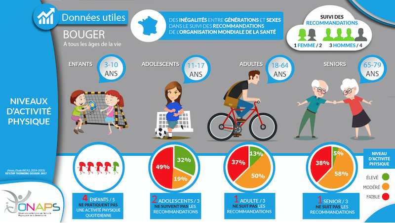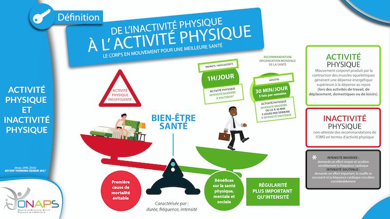 Pour ce qui est de “l’inactivité physique” : c’est quand on a un niveau d’activité physique qui est inférieur au niveau d’activité physique recommandé pour la santé. C’est à dire moins de 150 minutes par semaine pour les adultes et moins d’une heure par jour pour les enfants et les adolescents