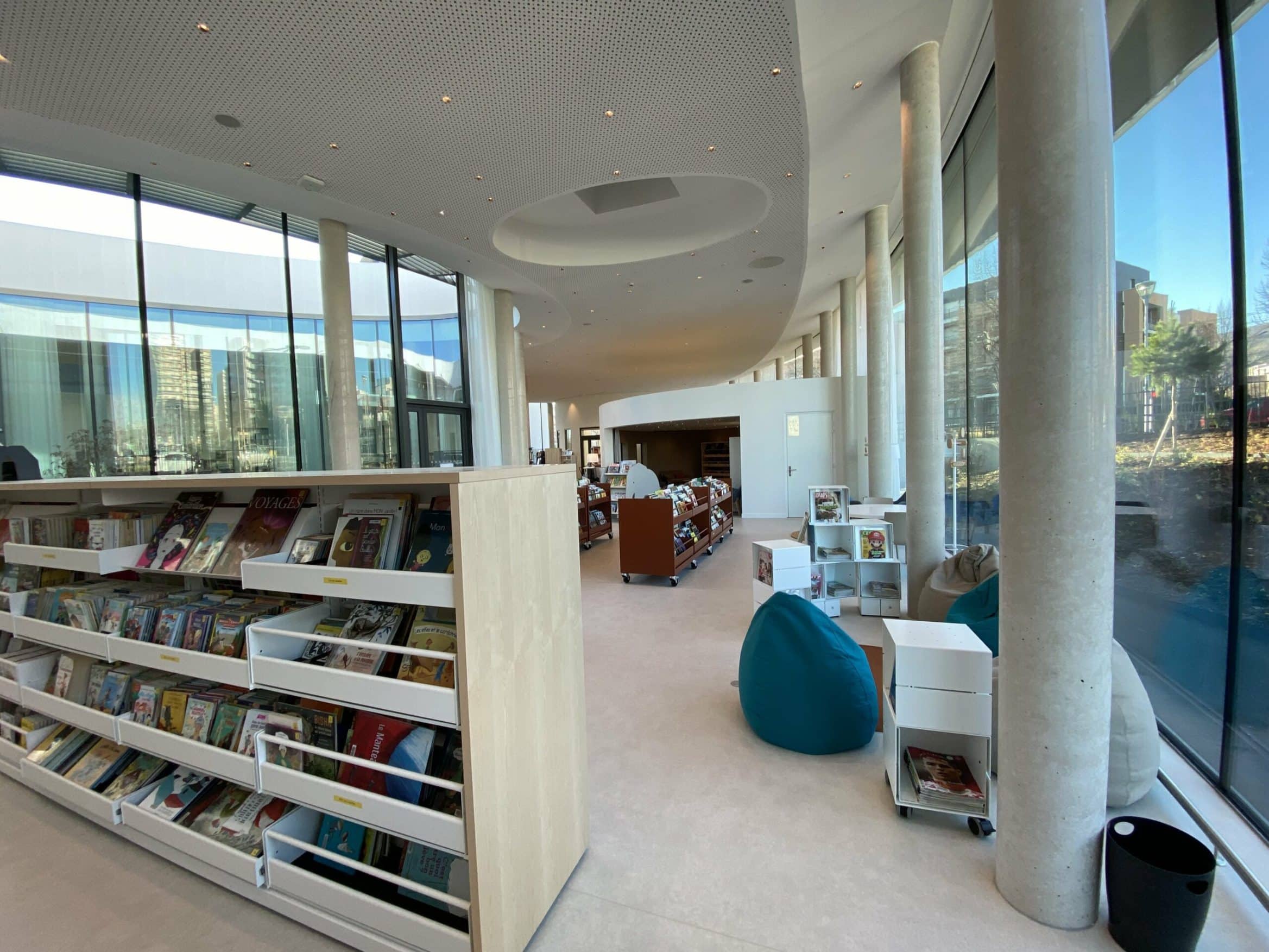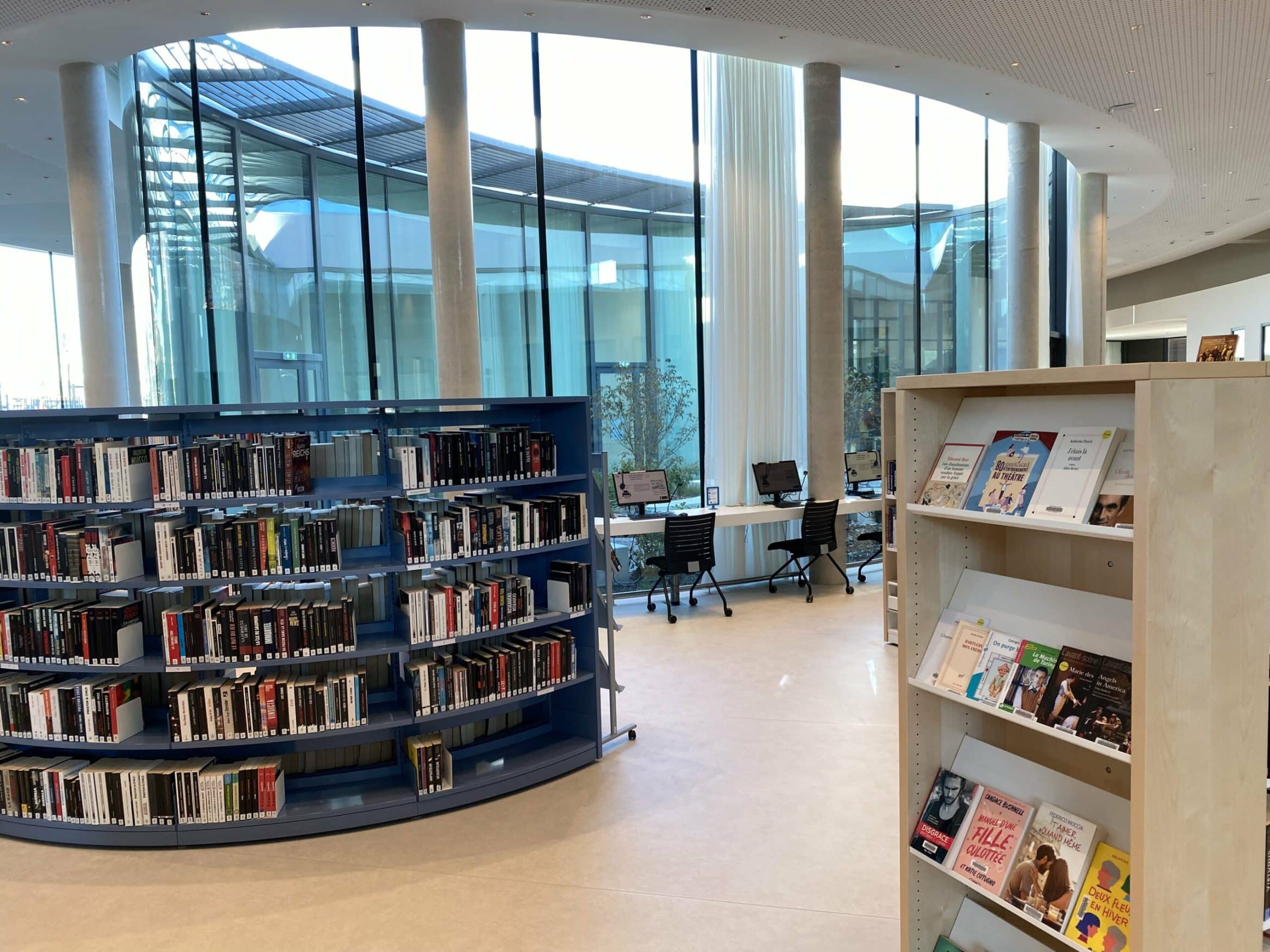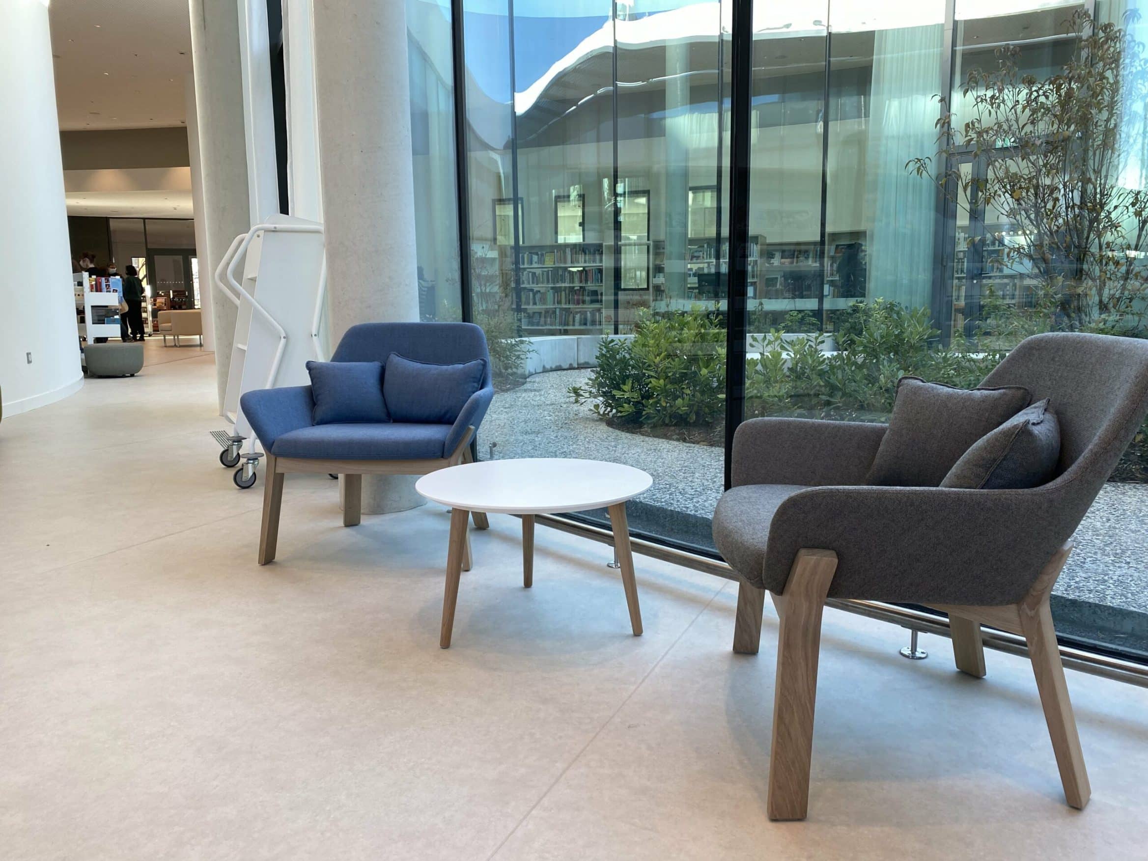 Des tables, des fauteuils, des chaises sont répartis tout autour des rayons pour encourager la lecture sur place. Le patio végétalisé extérieur situé au coeur de la médiathèque permettra aux jeunes et aux moins jeunes de profiter de l’air doux et du soleil.