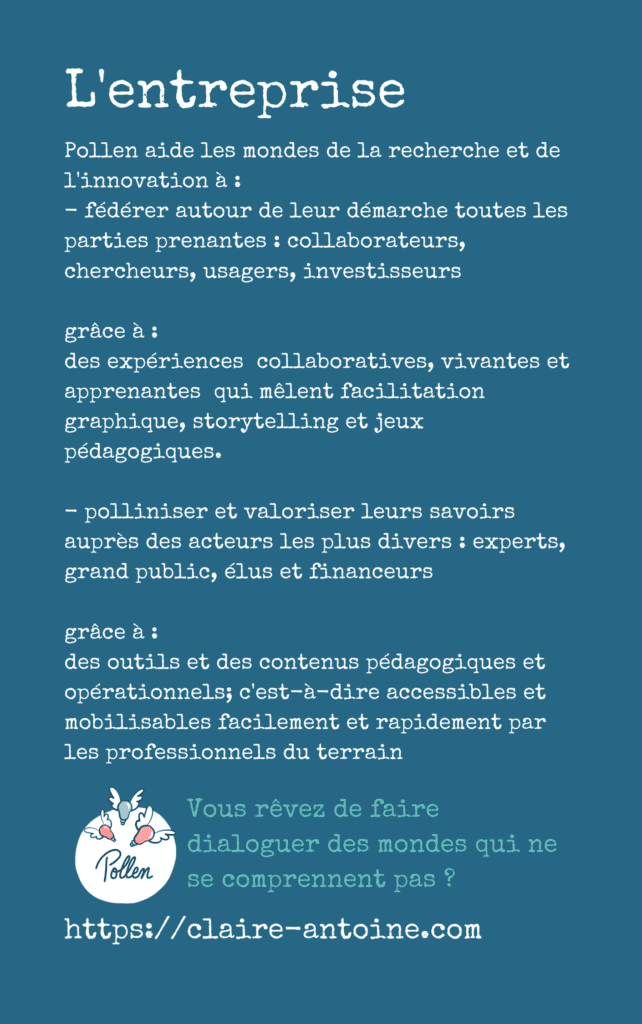 Je suis ingénieure designer. J’interviens dans le cadre de transformations, des démarches d’innovation et de recherches collaboratives. Je dirais que je suis une passeuse de sens et de savoirs. Je suis une traductrice et une médiatrice de la complexité. Avec mon entreprise Pollen, je travaille dans des environnements complexes où il est nécessaire d’engager tous les acteurs. Je collabore notamment avec des grands groupes, des dirigeants et porteurs de projets innovants sur des sujets de transformation, de démarche d’innovation et de recherche collaborative.