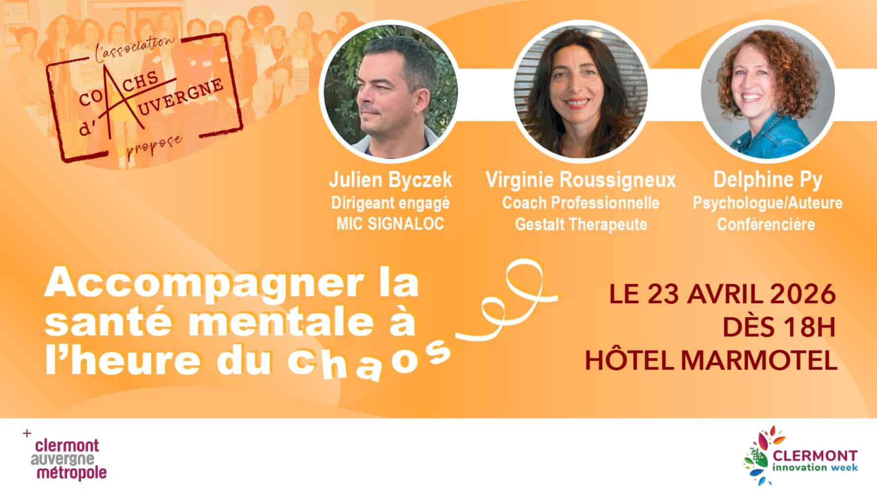 Dans le cadre de la Clermont Innovation Week 2026, l’association Coachs d’Auvergne bouscule les codes. Le mot d’ordre cette année ? Surprendre. C’est exactement ce que nous avons préparé : un format interactif et immersif pour sortir des sentiers battus et porter de nouveaux éclairages sur un défi majeur : comment accompagner l’humain dans l’incertitude ? Plutôt que de subir le chaos, venez apprendre à le transformer en levier de résilience. 3 experts, 3 regards sans filtre Delphine Py : Psychologue spécialisée en TCC et chroniqueuse santé mentale. Elle nous partagera des clés concrètes pour transformer l’anxiété et le stress en leviers d’action. Virginie Rossigneux : Executive Coach & Gestalt-thérapeute. Elle apportera son expertise sur le leadership inclusif et la coopération saine en entreprise. Julien B. : Chef d’entreprise (MIC SIGNALOC). Il partagera sa réalité de terrain sur la gestion humaine au quotidien dans un secteur technique en plein mouvement.