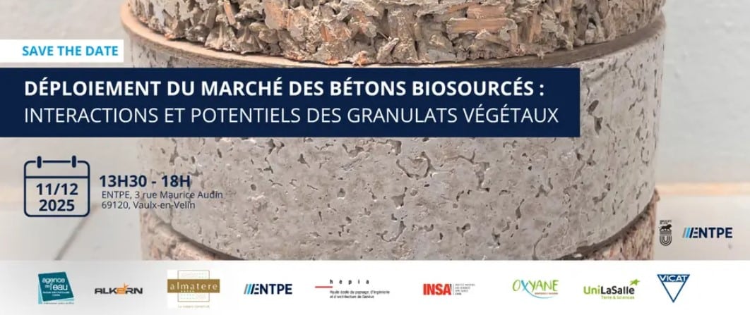 Colloque BIOBATEC : déploiement du marché du béton biosourcé : interactions, enjeux et potentiels des granulats végétaux. Le consortium BIOBATEC, a le plaisir de vous inviter à son colloque dédié au « Déploiement du marché du béton biosourcé : Interactions et potentiels des granulats végétaux » le 11 décembre 2025 à l’ENTPE. /// Au programme Sous le regard d’experts issus du bâtiment, du secteur agricole et de la recherche, suivez le parcours complet de systèmes constructifs valorisant des ressources agricoles locales, de la parcelle jusqu’à la fin de vie. 13h30 – Agriculture durable : de la parcelle à l’innovation – quand l’agriculture façonne la construction durable 14h05 – Granulats végétaux : une matière première biosourcée aux multiples avantages 15h30 – Systèmes constructifs : du laboratoire au chantier – les prérequis techniques et normatifs 15h30 – Pause 16h00 > Conception : optimiser et valoriser le potentiel des bâtiments biosourcés > Mise en œuvre : construire autrement – méthodes et innovations sur le terrain > Fin de vie : quelles pistes pour une valorisation et un recyclage efficients 17h35 : Fin