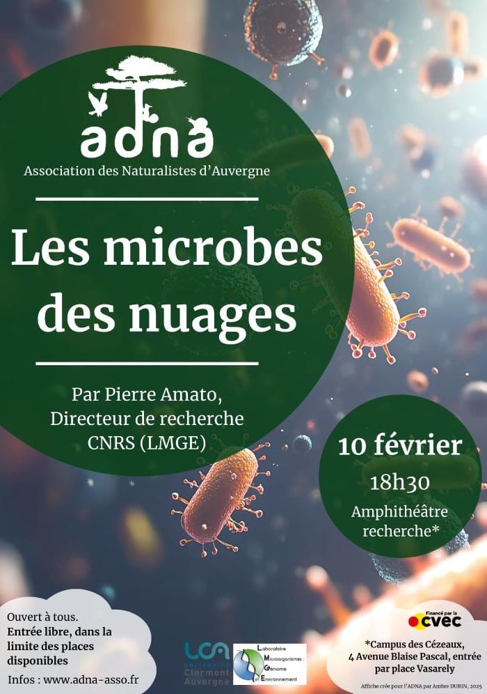L’Association des Naturalistes d’Auvergne (ADNA), organise une conférence sur le thème ‘Les microbes des nuages’, présentée par Pierre Amato, Chargé de recherche CNRS au Laboratoire Microorganisme Génome Environnement (LMGE) Des microorganismes (bactéries, champignons, virus) circulent dans l’atmosphère jusqu’aux nuages, qui peuvent constituer des oasis pour eux. Depuis les années 2000, leur biodiversité est étudiée autour de l’observatoire du puy de Dôme grâce à des approches multidisciplinaires. Les recherches portent sur leur dynamique, des aérosols aux précipitations, en combinant méthodes culturales, analyses moléculaires et caractérisation chimique et météorologique des masses d’air.
