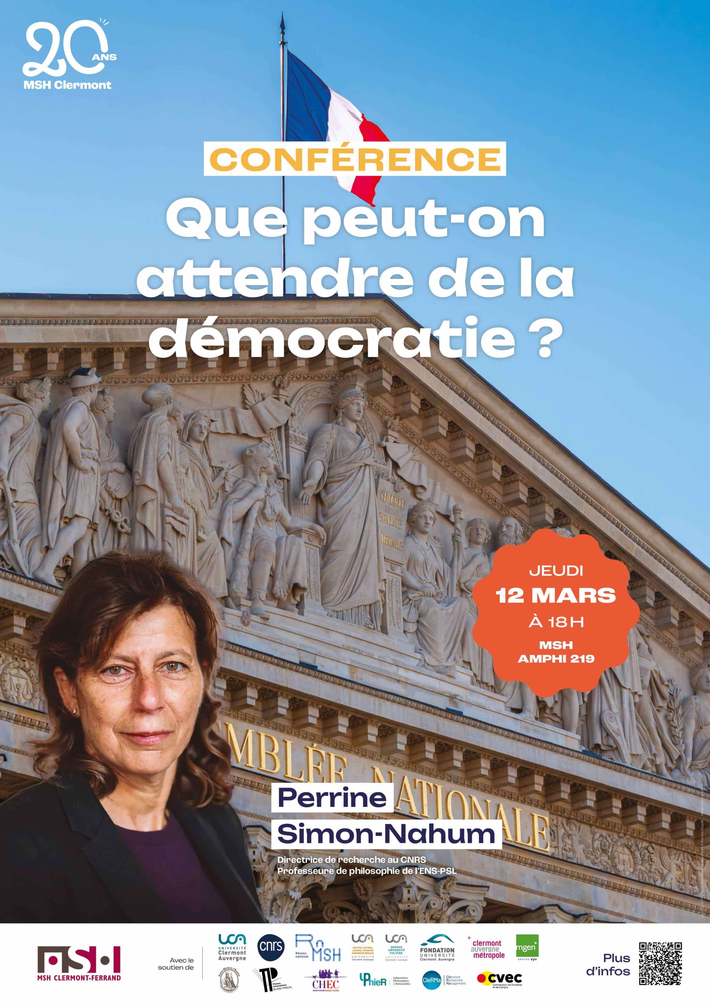 Fragilisée de toutes parts, la démocratie est aujourd’hui l’objet de profondes interrogations quant à ses promesses et à son avenir. À l’occasion de ses 20 ans, la Maison des Sciences Humaines de Clermont-Ferrand accueille Perrine Simon-Nahum, directrice de recherche au CNRS et professeure à l’École normale supérieure – PSL, pour une conférence intitulée « Que peut-on attendre de la démocratie ? »