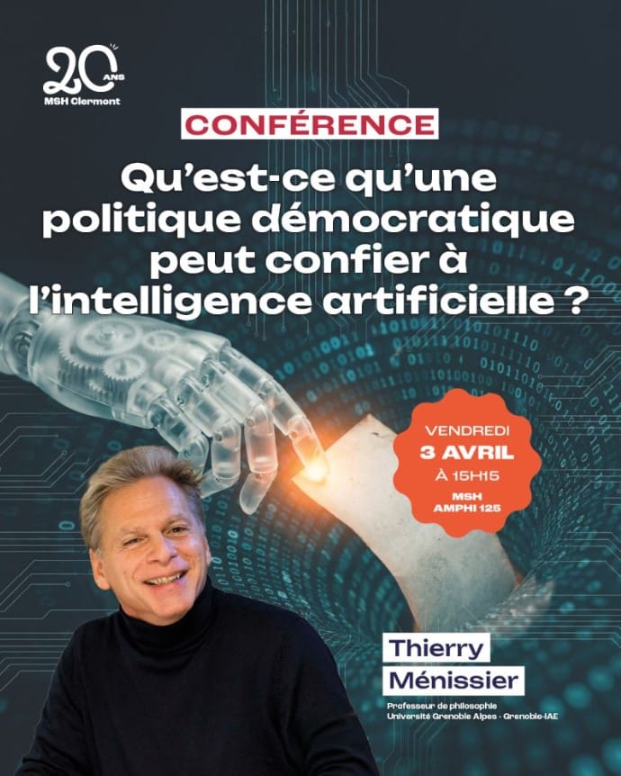 À l’occasion de ses 20 ans et du colloque interdisciplinaire « Le Chercheur, la Machine et le Monde », la Maison des Sciences Humaines de Clermont-Ferrand, en partenariat avec le PHIER et l’institut LLSHS, accueille Thierry Ménissier (Université Grenoble Alpes) pour une conférence intitulée « Qu’est-ce qu’une politique démocratique peut confier à l’intelligence artificielle ? » Les technologies d’intelligence artificielle bouleversent la société, en transformant les pratiques sociales et professionnelles. La sphère politique n’échappe pas à cette dynamique. Thierry Ménissier propose d’analyser ces mutations à travers les concepts fondateurs de l’activité politique démocratique : les principes de l’État de droit (respect de la pluralité, qualité de la délibération, équité) ; ses valeurs éthiques (responsabilité, tolérance, inclusion) ; et enfin les objectifs qu’elle poursuit (préservation des libertés publiques et privées, autonomie des citoyens et citoyennes). Dans ce contexte, quelles opportunités l’IA offre-t-elle à la démocratie ?