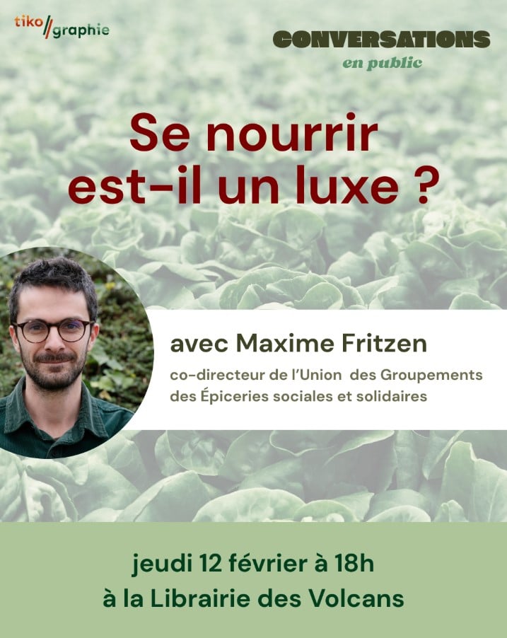 Dans cette Conversation avec Maxime Fritzen, co-directeur de l’Union Nationale des Groupements des Épiceries Sociales et Solidaires (UGESS), Marie-Pierre et son invité exploreront les thèmes de l’alimentation durable et de la justice sociale. Que sont les Conversations en public ? Une heure, un·e invité·e. Marie-Pierre DEMARTY, rédactrice en chef de Tikographie, dialogue avec une personnalité choisie pour son expérience et son point de vue sur un sujet en lien avec notre ligne éditoriale : comment garder un territoire vivable face aux crises climatiques ? Ce nouveau format donne la parole sur un temps long à un·e expert·e, pour creuser un sujet et prendre de la hauteur sur nos quotidiens à mille à l’heure.