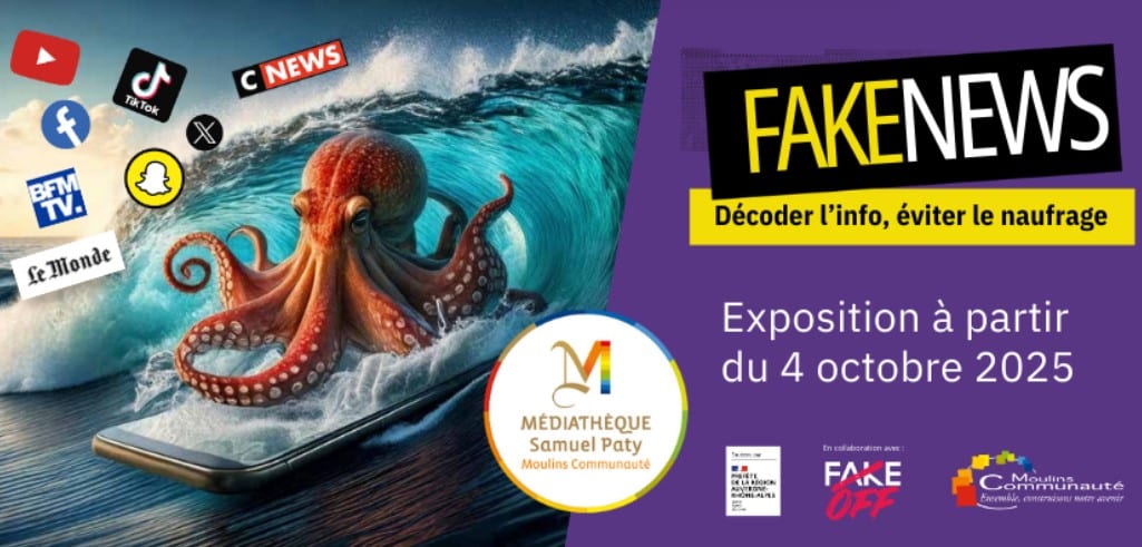 « Chaque jour, chaque minute, chaque seconde, l’info coule à flot… »* Nous n’avons jamais reçu ni partagé autant d’informations ; exactes comme inexactes. Si les fausses nouvelles et les rumeurs ont toujours existé, leur essor s’est considérablement accru ces dernières années avec le développement d’Internet, des smartphones, et des réseaux sociaux. Les conséquences de cette abondance peuvent être tragiques, dans la vie quotidienne de chacun mais aussi plus largement pour la liberté d’expression et la démocratie. L’exposition a lieu d’octobre à novembre à la médiathèque de Moulins. Le samedi 29 novembre à 16h aura lieu une conférence avec Jean-Lou Fourquet ‘Nos démocraties à l’épreuve des algorithmes’ : Ces deux dernières décennies, les géants du web ont déployé des algorithmes de recommandation toujours plus efficaces dans l’exploitation des failles cognitives humaines. Leur objectif : extraire le plus d’attention humaine et augmenter les profits associés quelles qu’en soient les conséquences. Quelles sont-elles, justement ?