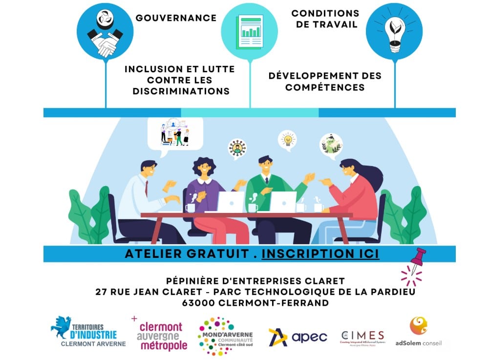 Clermont Auvergne Métropole et le Territoire d’Industrie Clermont Arverne, en partenariat avec l’APEC, CIMES et ADSOLEM Conseil organisent leur premier workshop sur la politique RH au cœur de la réussite de l’entreprise. Pourquoi et comment intégrer concrètement la RSE dans votre organisation ? AU PROGRAMME : Intervention d’experts Retour d’expérience d’acteur du territoire Temps de travail individuel sur les leviers activables dans votre organisation Un espace réseautage pour favoriser les échanges, les connexions et les coopérations. L’occasion parfaite d’échanger et de se tenir au courant des actualités autour de la politique RH. Inscription gratuite mais obligatoire