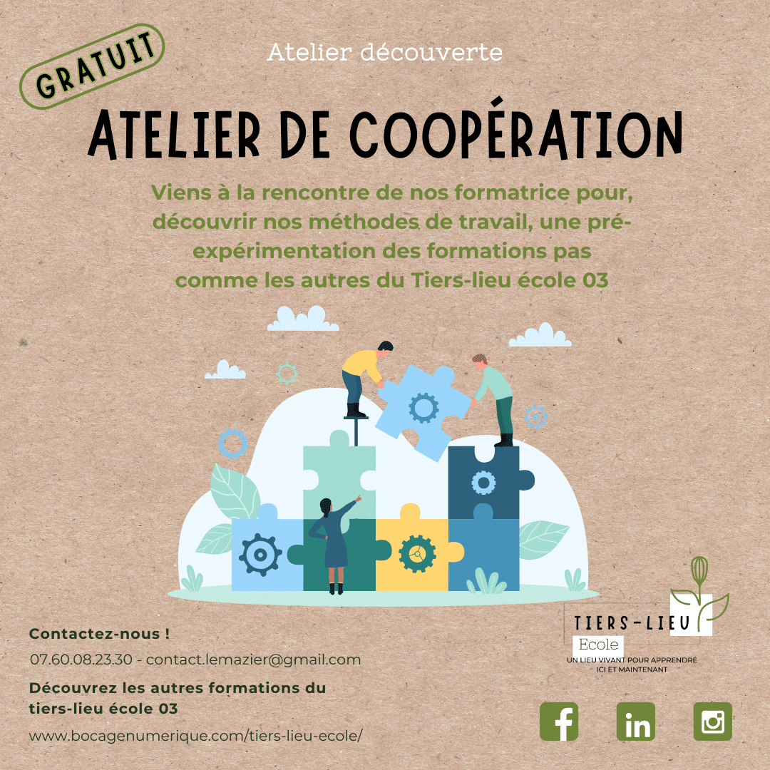 Intelligence collective et Gouvernance partagée. Atelier découverte « GRATUIT » Viens à la rencontre de nos formatrices ! Deux heures pour découvrir nos méthodes de travail, une pré-expérimentation des formations pas comme les autres du Tiers-lieu école 03