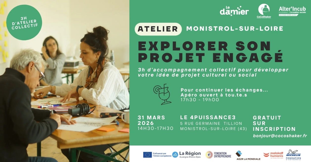 Vous avez une idée de projet pour faire bouger votre territoire ? Vous portez un projet qui a du sens ? CoCoShaker propose un atelier de 3h le mardi 31 mars pour vous accompagner dans le développement de votre projet ! Au programme : 14h30 – 17h30 | Atelier « Explorer son projet engagé » Un temps de travail collectif pour avancer concrètement sur votre projet : Clarifier votre problématique sociale et/ou environnementale, votre mission et votre vision Échanger avec d’autres porteur.e.s de projets engagé.e.s Découvrir l’incubateur CoCoShaker et ses parcours d’accompagnement 17h30 – 19h | Apéro « S’engager et entreprendre sur son territoire » Ouvert à tou.te.s – porteur.e.s de projet ou simplement curieu.x.ses ! Un moment convivial pour rencontrer des entrepreneur.e.s locaux, élargir votre réseau et partager un verre autour de produits locaux.