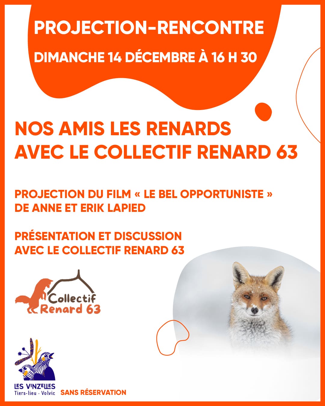 Goûter projection sur nos amis les renards avec Le Collectif Renard 63 Projection du très beau film « Le bel opportuniste » de Anne et Erik Lapied. (durée 30mn) Prix Connaître et protéger du Festival International du Film Ornithologique de Ménigoute (FR) La projection sera suivie d’une discussion avec des représentantes du Collectif Renard 63. Le Collectif Renard 63 réunit à ce jour 50 associations locales et nationales qui portent une demande de déclassement du Renard roux de la liste des ESOD, anciennement Nuisibles, dans le Puy-de-Dôme. Leurs actions reposent sur la mobilisation et la sensibilisation des élus, des agriculteurs et du grand public sur le statut attribué à cette espèce en dépit du rôle bénéfique qu’il joue au sein de l’écosystème et pour les activités humaines. A partir d’un argumentaire scientifique, ils visent à améliorer l’image de cette espèce injustement mal-aimée, car profondément méconnue. Entrée libre