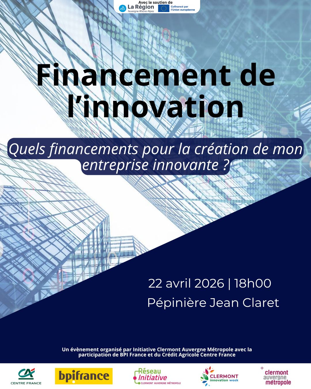 Le rendez-vous pour obtenir des réponses concrètes et de découvrir les dispositifs qui peuvent booster votre lancement. Financement de l’innovation : Comment financer la création de mon entreprise innovante ? Le 22 avril à la Pépinière Jean Claret – dans le cadre de la Clermont Innovation Week Au programme : – Présentation des dispositifs de financement – Témoignage d’une entrepreneuse inspirante – Échanges avec les experts : BPI France, Crédit Agricole Centre France – Questions / réponses dans une ambiance pro mais détendue Pensez à vous inscrire pour ne rien manquer Venez poser toutes vos questions et repartez avec des réponses (et peut-être un coup de pouce pour lancer votre projet) !