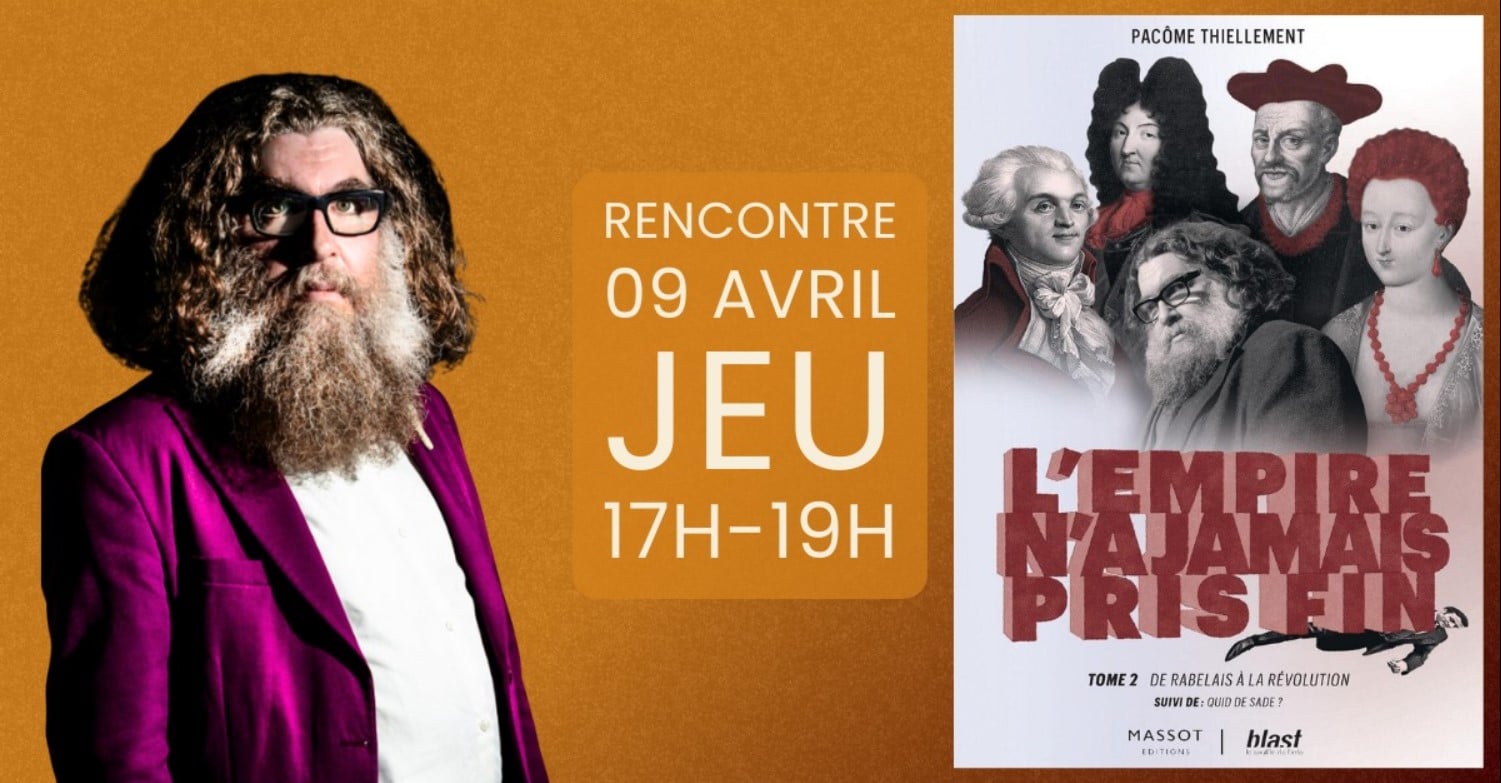 Jeudi 9 avril, de 17h à 19h, la librairie Les Volcans accueille Pacôme Thiellement, essayiste, vidéaste et chroniqueur chez Blast (Infernet, La fin du film, L’Empire n’a jamais pris fin), pour une rencontre autour de son ouvrage L’Empire n’a jamais pris fin Tome 2, une traversée vertigineuse de notre histoire politique, culturelle et spirituelle. Dans ce livre, Pacôme Thiellement propose une relecture radicale du passé, non comme un récit figé mais comme un champ de forces encore actives, traversé par des luttes visibles et souterraines. De Rabelais à la Révolution française, il explore la disparition des rites populaires, la mise à mort symbolique des rois de Carnaval, la naissance de la violence politique et l’émergence de l’État moderne, ce « monstre » forgé par Richelieu et incarné par la monarchie absolue.