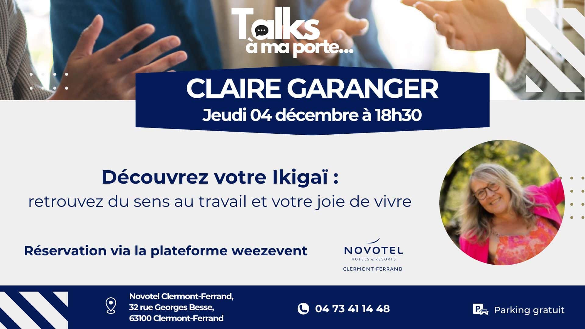 Les Talks à ma porte, c’est votre rendez-vous mensuel à Clermont-Ferrand pour s’inspirer, échanger et grandir ensemble. Jeudi 4 décembre, Claire Garanger vous propose un atelier ludique et pratique pour explorer votre Ikigaï : la méthode japonaise qui vous aide à retrouver du sens au travail, plus d’énergie et de motivation au quotidien. Pour qui ? Salariés, managers, indépendants – tous ceux qui veulent donner un nouvel élan à leur vie professionnelle. Au programme : Découverte de l’Ikigaï, échanges entre pairs, outils concrets à emporter. Où ? Novotel Clermont-Ferrand Quand ? 18h30-20h Tarif : Gratuit (réservation obligatoire)