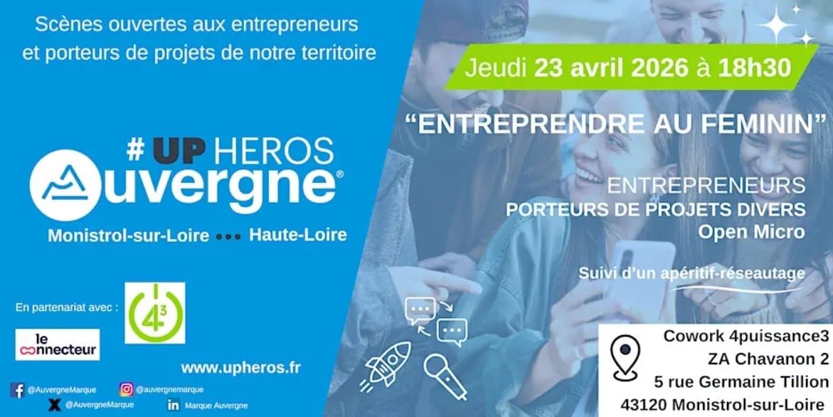 Scène ouverte aux porteurs de projets et entrepreneurs du territoire à Monistrol-sur-Loire en Haute-Loire. Venez découvrir des projets autour de la thématique : ‘Entreprendre au féminin’ avec des entrepreneures aux parcours inspirants et aux idées ambitieuses et créatives. Le #Upheros Auvergne, c’est l’occasion de rencontrer, découvrir, échanger avec des porteurs de projets, des entrepreneurs des acteurs et associations d’Auvergne. De belles initiatives de à découvrir ! Un format informel et convivial en deux temps : 1 heure (max) de pitchs, 1 heure d’apéro-réseautage. Des événements coorganisés par l’association marque Auvergne qui porte la marque officielle du territoire et ses partenaires bénévoles sur les 4 départements auvergnats.