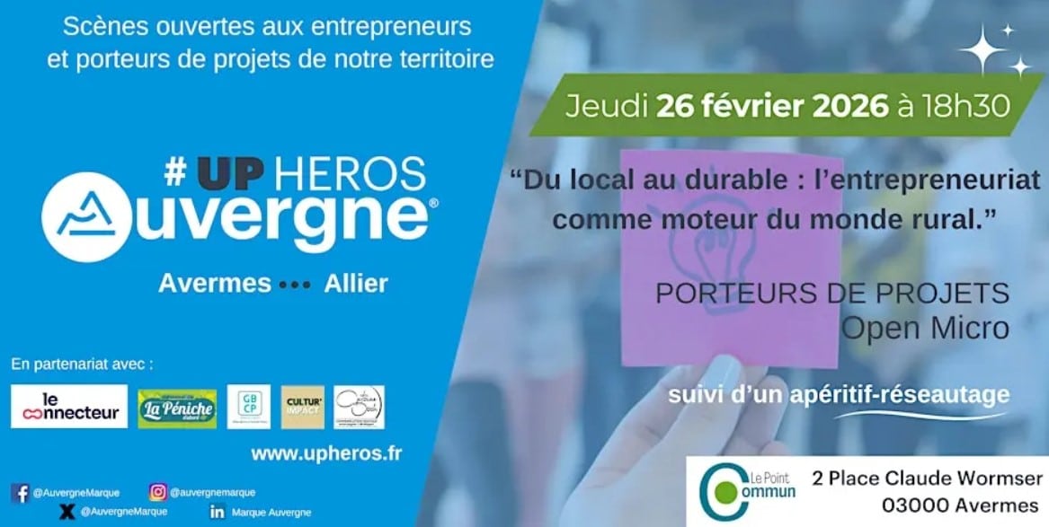 Oyé, Oyé, c’est la rentrée et c’est reparti pour de nouveaux #Upheros Auvergne ! On revient plein d’énergie et de volonté pour valoriser l’entrepreneuriat en Auvergne avec notre super équipe des #Upheros Moulins & ses alentours ! Venez assister à notre prochaine scène ouverte aux porteurs de projets le jeudi 26 février à 18h30 sous la thématique « Du local au durable : l’entrepreneuriat comme moteur du monde rural ». ‘ . Merci à l’équipe du Point Commun à Avermes de nous accueillir !