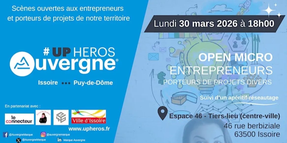 Scène ouverte aux porteurs de projets et entrepreneurs au tiers-lieu Espace 46 à Issoire. Venez découvrir des projets du territoire. Le #Upheros Auvergne, c’est l’occasion de rencontrer, découvrir, échanger avec des porteurs de projets, des entrepreneurs des acteurs et associations d’Auvergne. De belles initiatives de femmes et hommes du territoire à découvrir ! Un format informel et convivial en deux temps : 1 heure (max) de pitchs, 1 heure d’apéro-réseautage. Des événements coorganisés par l’association marque Auvergne qui porte la marque officielle du territoire et ses partenaires bénévoles sur les 4 départements auvergnats.
