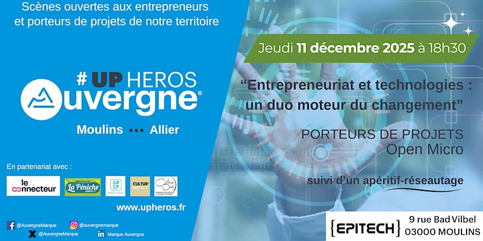 Venez assister à notre scène ouverte aux porteurs de projets et entrepreneurs du territoire ! Oyé, Oyé, c’est reparti pour un nouveau #Upheros Auvergne à Moulins dans l’Allier ! On revient plein d’énergie et de volonté pour valoriser l’entrepreneuriat en Auvergne avec notre super équipe des #Upheros Moulins ! Venez assister à notre prochaine scène ouverte aux porteurs de projets le jeudi 11 décembre à 18h30 sous la thématique ‘Entrepreneuriat et Technologies : un duo moteur du changement’ . Merci à l’équipe de l’école Epitech de nous accueillir ! L’occasion de remercier également Gilles Boireau, notre fidèle partenaire animateur pour nos Upheros Moulins & alentours et Antoine Bach qui l’a rejoint en soutien et appui dans la co-animation de nos #Upheros Moulins dans l’Allier.