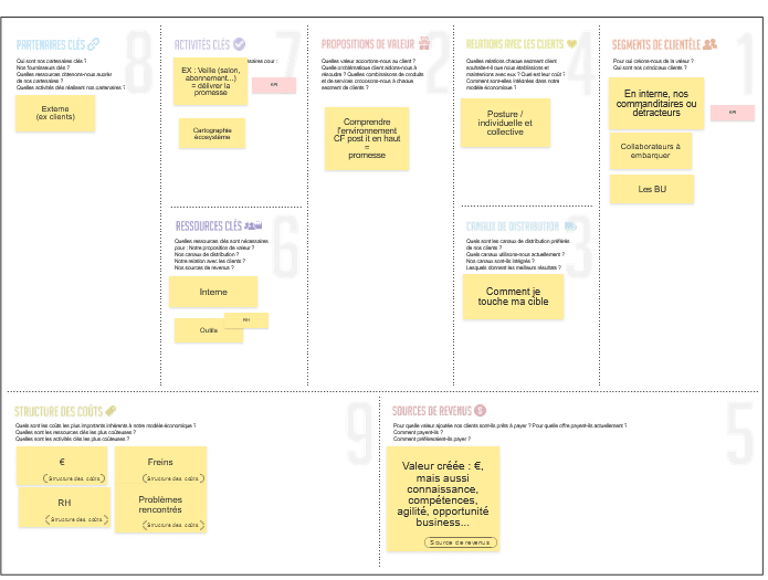Leur réflexion s’est structurée autour d’un Business Model Canva. En effet, ce modèle permet de parcourir l’ensemble des « clients » concernés par la démarche d’open innovation. Les canaux à actionner, le type de relations entretenues, les ressources et activités clés déployées, les partenaires à engager, le réseau à créer, les coûts et revenus générés … pour formuler une ou plusieurs propositions de valeurs. Et les KPI à y associer.